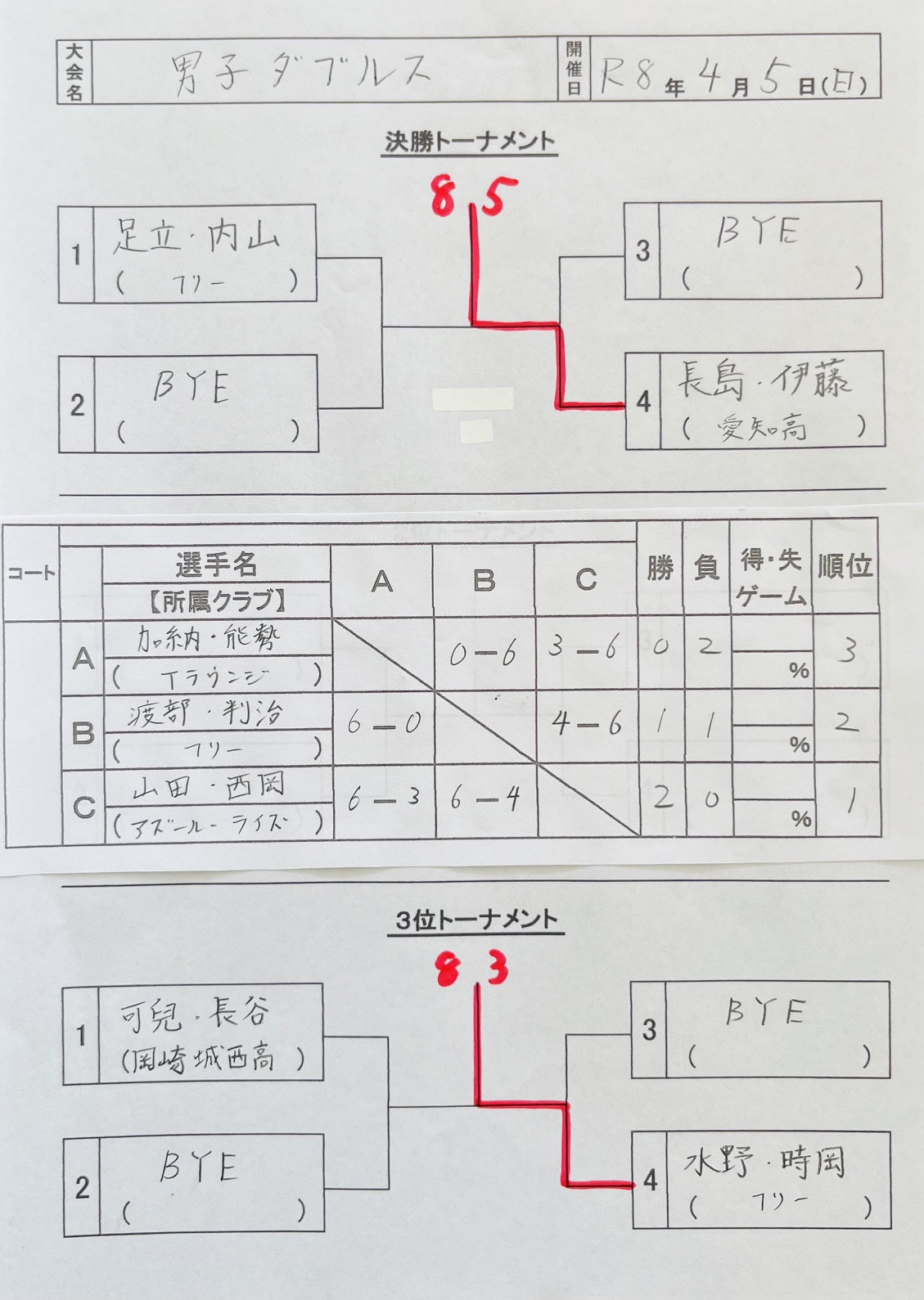 ホームお知らせ・試合結果 【試合結果】2026年04月05日 男子ダブルス 優勝おめでとうございます。ペアの良かった所を教えて下さい。 いっぱいありますが特にポーチボレーの角度です(長島→伊藤)安定したストローク、ピンチの時に一本取ってくれるところです。